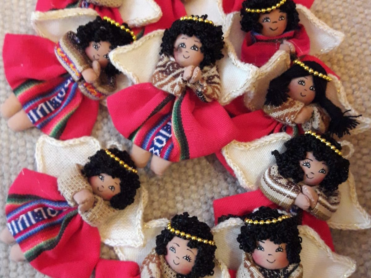Diese Stoffengerl in vier Varianten repräsentieren die Vielfalt der Kulturen und Menschen in Bolivien und tragen traditionelle Stoffe.